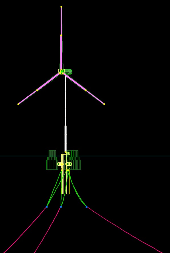 While my secondment at Oceanflow Energy Ltd. I had the chance to learn how to use OrcaFlex software. I heleped OFE to implement a contrarotating moment in the idealised rotor representation. For that purpose, we divided each blade in several sections to account twist angle as well as drag and lift coefficents. It follows an schematic represantation of StarFloat 6MW in OrcaFlex: